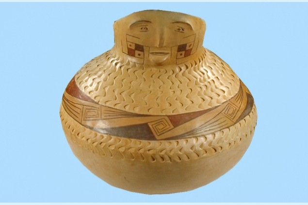 painted effigy jar with checkerboard on the cheeks, and painted black